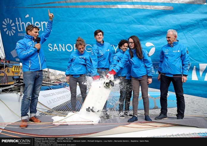 Le Multi50 Solidaires En Peloton – ARSEP a été baptisé à Saint-Malo. Thibaut Vauchel-Camus, le skipper qui porte le message d’espoir « vaincre ensemble la Sclérose En Plaques », Victorien Erussard, Bernard Gentric, vice-président de la Fondation ARSEP et président de l’association Défi Sports Solidaires, Michaël Gregorio, Marine Barnérias, Lou Hellin et Clément Cablé, les marraines et parrains, l’ensemble des partenaires du Défi Voile ainsi qu’un grand nombre de spectateurs ont lancé le nouveau trimaran aux couleurs de Solidaires En Peloton et de la Fondation ARSEP dans l’arène océanique. Thibaut Vauchel-Camus, guadeloupéen, malouin d’adoption, va désormais attaquer sa saison 2018 dont l’apogée sera le départ, le 4 novembre prochain, de la Route du Rhum – Destination Guadeloupe.