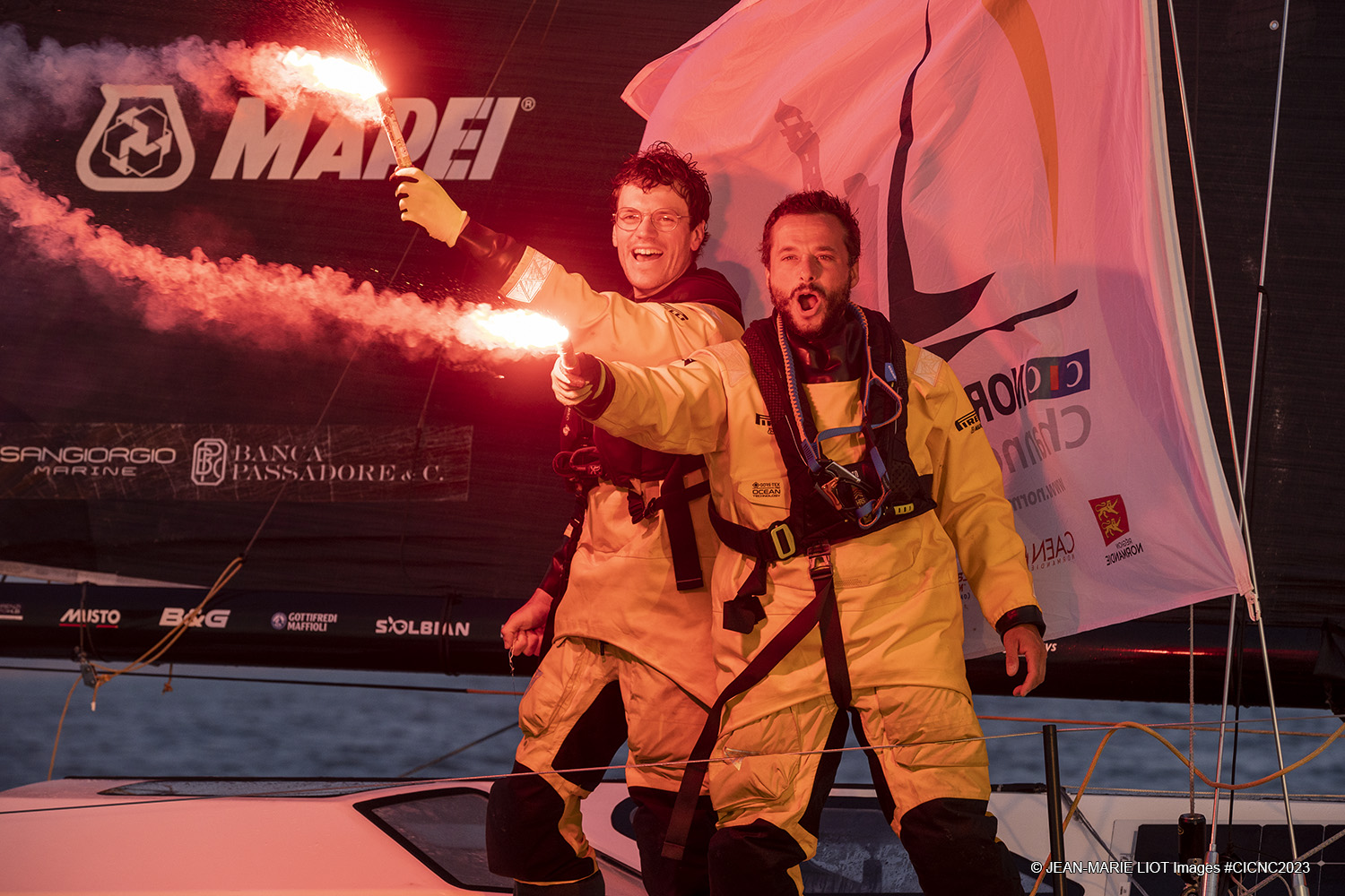 Une deuxième place méritée pour Ian Lipinski et Antoine Carpentier, auteurs d’un départ splendide et qui auront joué les avant-postes tout au long de la course « Nous sommes fiers de cette deuxième place. On a un bateau qui commence à dater, le plus ancien des scows, donc on est content de notre résultat même si évidemment on aurait aimé faire mieux. Nous sommes très heureux pour Ambrogio et Kévin, ils ont été meilleurs que nous donc c’est normal qu’ils remportent cette CIC Normandy Channel Race. » déclarent les magnifiques dauphins de cette CIC Normandy Channel Race 2023.