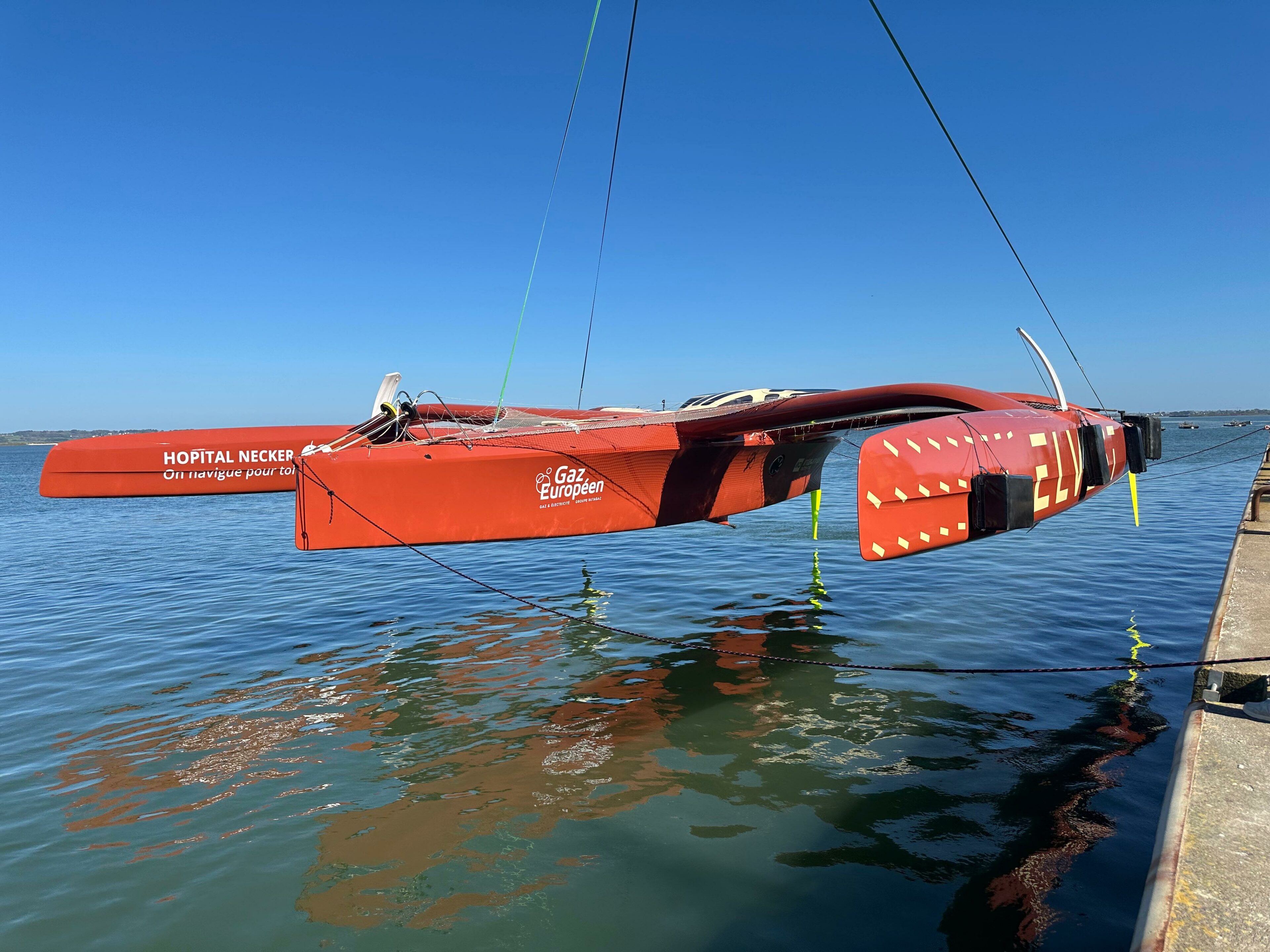 Après un important chantier hivernal, le trimaran se présente aujourd’hui sous une nouvelle identité : ELVEST. Au-delà du travail technique mené ces derniers mois — remise à niveau complète, remplacement du mât et des voiles, optimisation de l’ergonomie et de l’électronique — le bateau affiche désormais une nouvelle décoration.