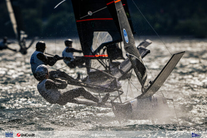 La quatrième journée du Championnat du monde Moth 2025 s’est ouverte à l’aube ce 11 juillet avec un nouveau départ matinal pour les 137 athlètes de 25 nations en lice sur le lac de Garde. Le premier signal d’alerte était prévu à 8h30, et le petit matin, une bonne brise de nord soufflait, idéale pour terminer les deux dernières courses qualificatives avant la séparation des flottes Or et Argent. Le Français Enzo Balanger s’est illustré dans les deux courses, remportant deux victoires consécutives