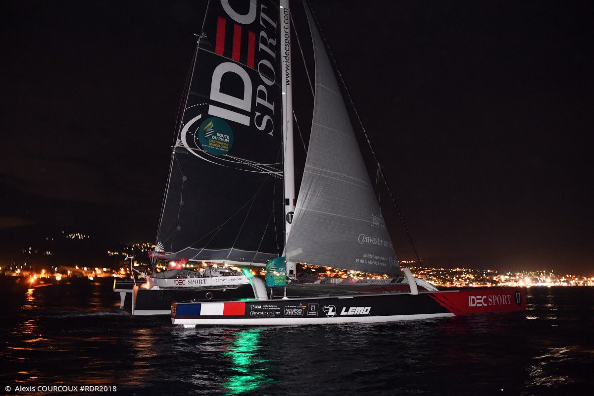 A 4h du matin, les deux bateaux sont à 1,2 milles de l’arrivée. Le vent est tombé et tourne. Idec Sport est quasiment à l’arrêt. Il va falloir effectuer un dernier virement pour rejoindre la ligne. Macif est derrière à 300 mètres d’Idec Sport et avance légèrement plus vite. Les deux bateaux arrivent bord à bord vers la ligne d’arrivée de nuit. Les deux bateaux virent à tour de rôle. Idec Sport le premier suivit par Macif. Quelques minutes plus tard, Francis Joyon franchit la ligne d’arrivée. Il remporte la Route du Rhum et bat le record de Loic Peyron d’1h de mieux en 7 jours 14 h 21’47’. Francois Gabart coupe la ligne 7 minutes plus tard, soit 428 secondes.