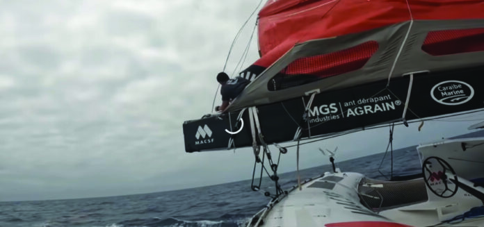 Oui la bosse de ris a pété. Jean-Baptiste Vaillant qui m’a coaché en peu de temps de façon vraiment incroyable l’avait anticipé et m’avait dit: « Ça, c’est le genre de truc qui peut péter et qui risque de péter ». Donc il avait déjà réfléchi à la technique pour faire quelque chose et pouvoir le remplacer. Ce que j’ai fait hier, j’ai grimpé dans la bôme. C’est toujours un peu délicat d’aller en mer dans le bout de la bôme comme ça, mais j’ai pu réparer. Tout ça pour dire que le bateau commence à bien fatiguer. Je vais sûrement faire tomber ma grand-voile aussi parce que je vois qu’au niveau de certains chariots, j’ai des sandows qui commencent à fatiguer. Cela commence à faire longtemps que le bateau est dans l’eau.