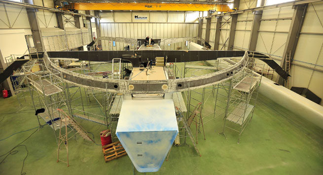 Si la mise à l’eau, initialement prévue en juillet devrait prendre un mois de retard suite à ces modifications, le chantier ne s’arrête pas pour autant pendant un mois. Jour après jour, le plus grand trimaran du monde prend forme dans le chantier lorientais de CDK Technologies. La coque centrale, longue et monumentale, est désormais surmontée de ses deux bras de liaison et de la barre d’écoute de grand-voile qui dessine un grand arc de cercle vers l’arrière du bateau. Les deux flotteurs, dont le transport a nécessité les mêmes moyens exceptionnels que pour la coque centrale, sont arrivés à Lorient. Les équipes qui oeuvrent autour de ce géant des mers ont déjà posé les aménagements intérieurs, les puits de dérive, les palliers des safrans, etc. « Toutes les modifications seront réalisées chez CDK à Lorient, précise Ronan Lucas. Les deux pièces de 18×1 m seront fabriquées chez JMV (à Cherbourg, ndlr) puis posées à Lorient. Mais la construction poursuit son cours par ailleurs. Finalement, ce mois supplémentaire va nous permettre de peaufiner les détails en chantier. » Même si le maxi-trimaran ne sera mis à l’eau que la deuxième quinzaine d’août, les premières voiles ont déjà été livrées. L’électronique, l’hydraulique, l’électricité, le matelotage et bien d’autres secteurs sont autant de mini chantiers qui progressent en parallèle les uns des autres. Chaque semaine, de nouvelles pièces du puzzle sont assemblées et formeront dans moins de quatre mois le plus grand trimaran de course jamais construit.