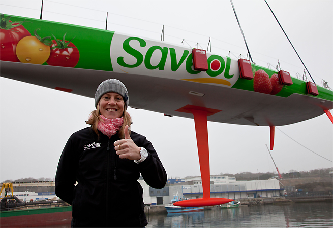 La navigatrice britannique Samantha Davies s’élancera le 10 novembre prochain à la conquête de son deuxième tour du monde en solitaire à la voile, cette fois avec son nouveau sponsor, Savéol. Depuis le début de l’année 2012, Sam et son équipe technique ont pris possession de son bateau, racheté à Veolia fin 2011, l’ex-60 pieds de Roland Jourdain. Depuis son acquisition, le monocoque a fait l’objet d’une vérification complète, de modifications ciblées notamment au niveau de l’électronique ou du câblage du mât. Le 60 pieds présente désormais un nouvel habillage aux couleurs de Savéol.