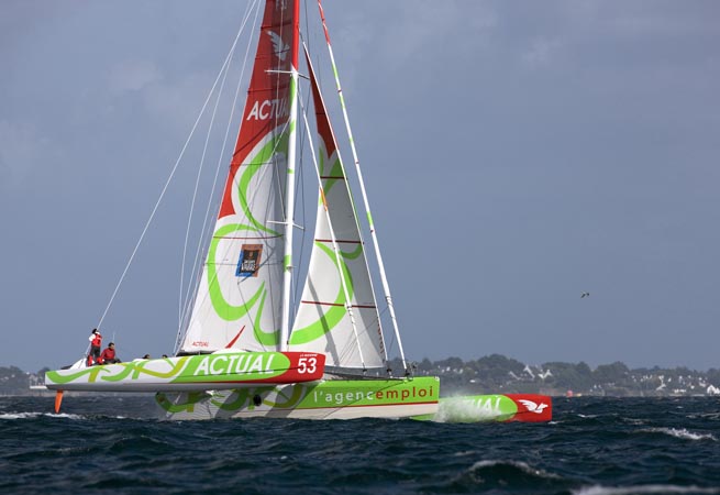 Les 6 heures 48 minutes d’Anne Caseneuve en 2008 ont été divisés par deux, puisque l’équipage d’Actual, skippé par Yves Le Blévec, a bouclé les 41 milles du parcours en 3 heures 24 minutes et 52 secondes, soit une moyenne théorique d’environ 12 nœuds. Arrivé à 13h24’52’’, le trimaran de 50 pieds, à bord duquel naviguaient notamment Eric Loizeau a devancé d’un peu plus de 8 minutes, My Way, 40 pieds barré par François Seguin, avec notamment à bord Thomas Coville, Jacques Vincent et le tandem Pierre Leboucher-Vincent Garos, qui préparent actuellement les Jeux olympiques de Londres en 470. Le podium au scratch est complété par Tribule, un Exploder 25 conçu et construit en Pologne, qui a coupé la ligne à 13h50’04’’. Le premier monocoque est, sans surprise, l’Open 60 Safran de Marc Guillemot, à bord duquel naviguait notamment Karine Fauconnier.