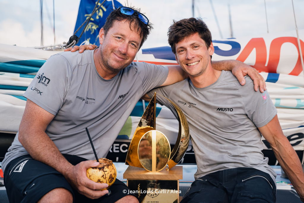 Le duo normand Guillaume Pirouelle et Cédric Chateau, réguliers dans le groupe de tête dès le départ du Havre, signent une course combative et exemplaire. Deuxième à La Corogne, 21 minutes seulement derrière SNSM FAITES UN DON !, les Havrais choisissent ensuite une route plus au sud dans l’Atlantique. Un pari mesuré mais qui se révèle progressivement gagnant. Mille après mille, ils réduisent l’écart, portés par une belle vitesse dans les alizés. Avec patience, ils finissent par prendre la tête de la flotte à quelques jours de l’arrivée en Martinique. Et s’y accroche jusqu’au bout. La course aura été serrée jusqu’au bout ; ils remportent la TRANSAT CAFÉ L’OR Le Havre Normandie avec un écart de 7 minutes devant les deuxièmes. Cette victoire confirme leur statut de favoris en Class40. Elle témoigne aussi de leur capacité à rebondir : deux ans après leur collision au départ de l’édition 2023, qui les avait contraints à d’importantes réparations avant de terminer quatorzièmes, les Normands signent ici une performance remarquable et pleinement aboutie.