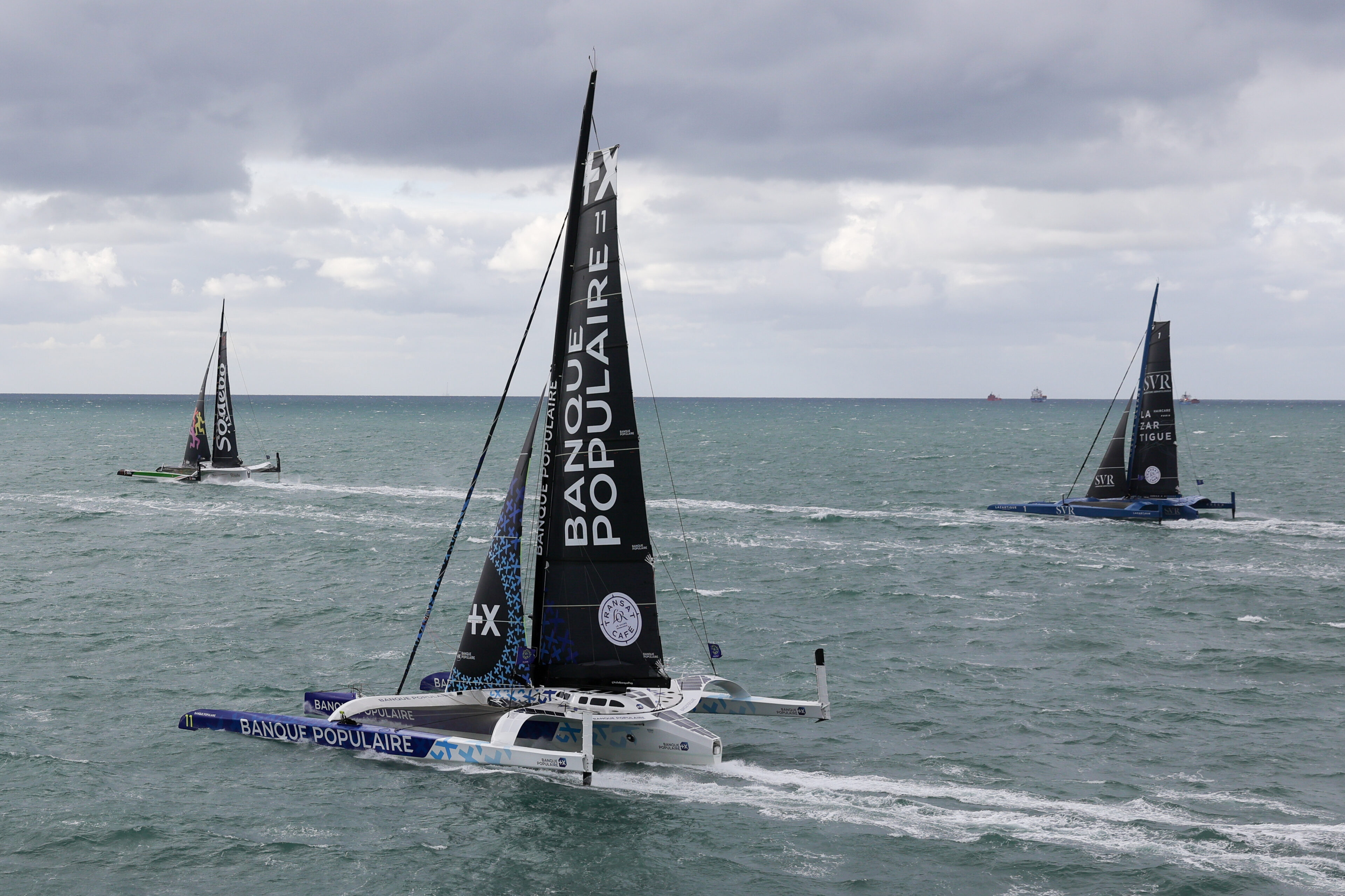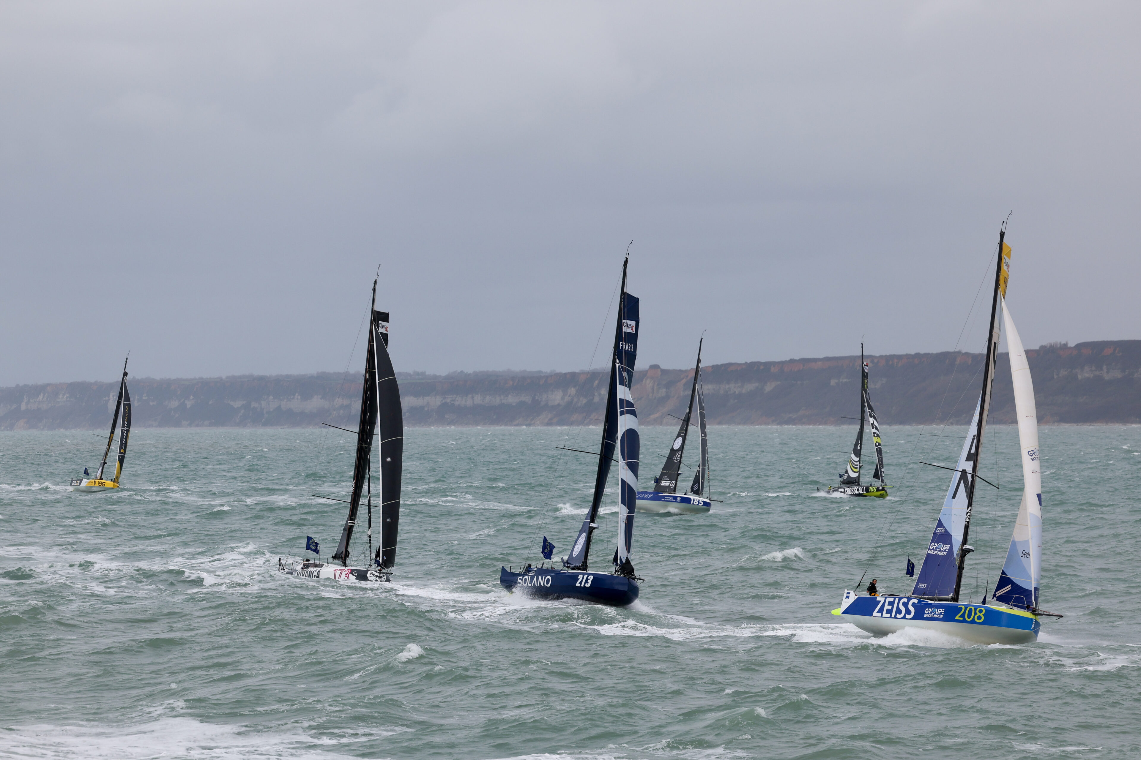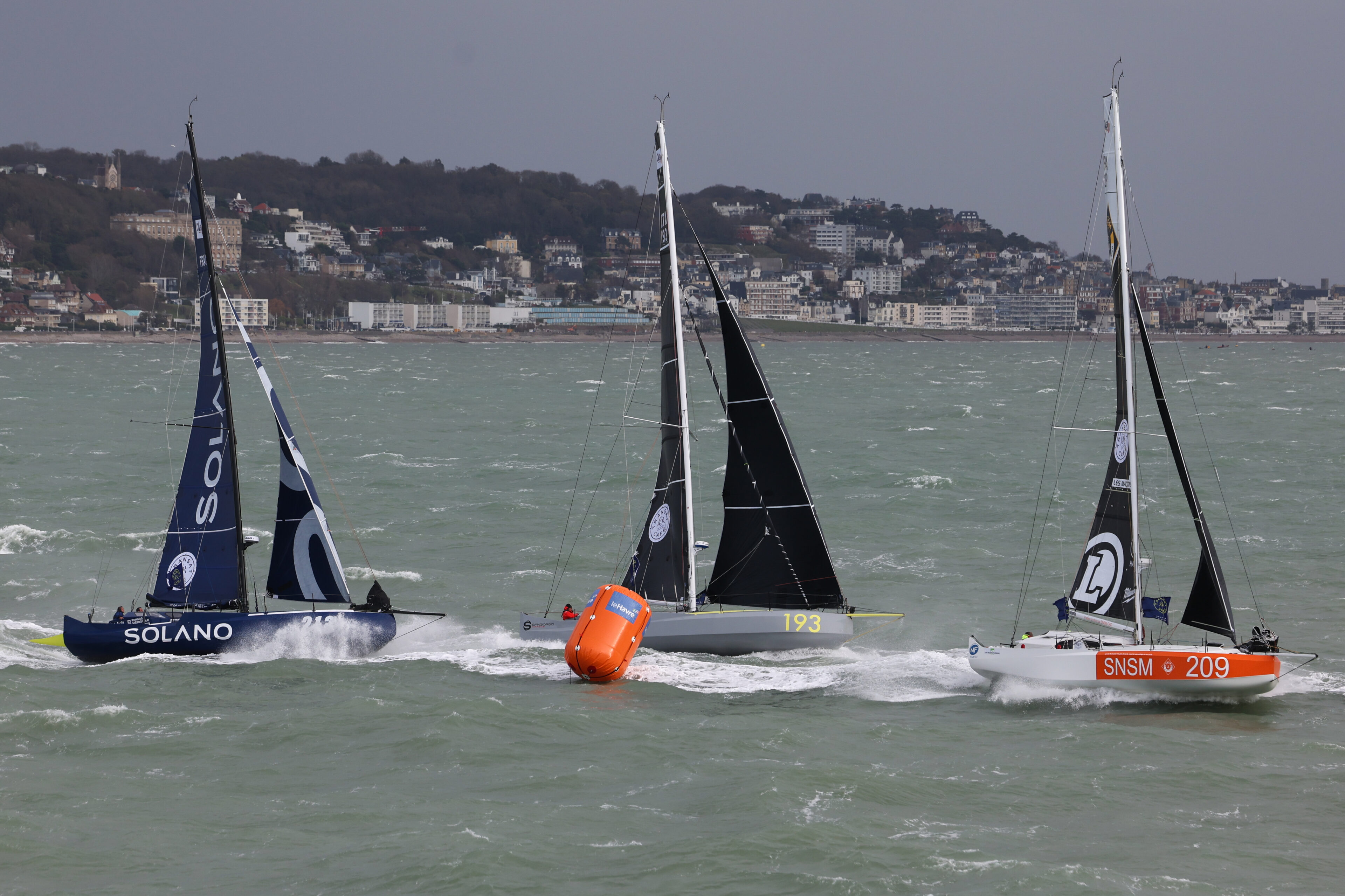 Vingt minutes plus tard, les IMOCA se placent. Leurs sillages irréguliers témoignent de leur impatience. Lancés comme une flèche, Louis Burton et Clément Commagnac (Bureau Vallée) s’envolent en tête avant de se faire griller la priorité par Jérémie Beyou et Morgan Lagravière (Charal) au détour de la bouée Normandie.