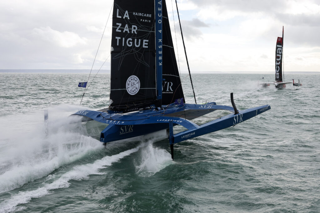 À la VHF, les mots “bon départ” ont retenti trois fois, signifiant que chaque classe était désormais engagée sur la TRANSAT CAFÉ L’OR Le Havre Normandie. Une autre voix a résonné, celle de la marraine de cette 17e édition, l’astronaute Claudie Haigneré, qui a tenu à encourager chaque catégorie de bateaux dans leur périple vers Fort-de-France. Comme une première confrontation, les éléments étaient bien décidés à ne pas faciliter la tâche des skippers au départ. Dans une mer formée et sous un vent soutenu d’environ 18 nœuds, les ULTIM ont ouvert le bal. Anthony Marchand et Julien Villion (Actual ULTIM 4) franchissent la ligne en premier ainsi que la bouée Normandie (première marque de parcours).