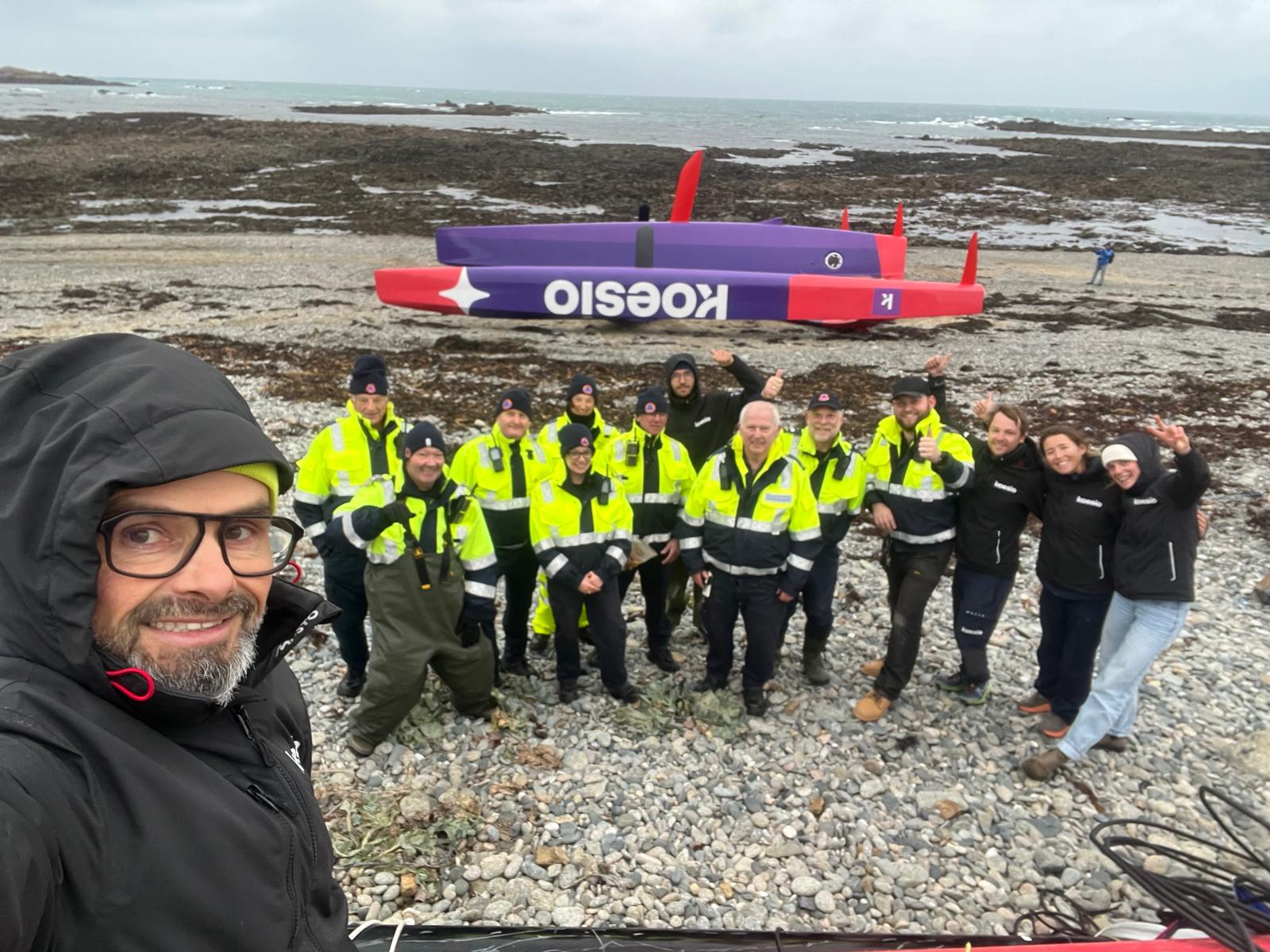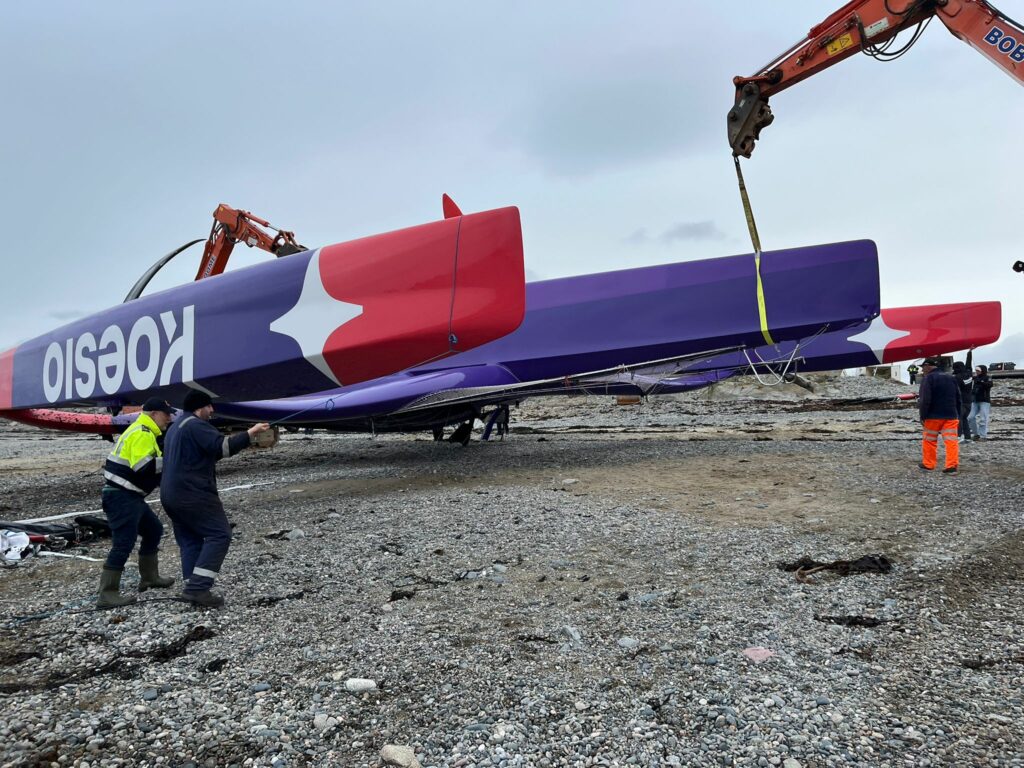 Face à l’urgence imposée par la marée montante, plusieurs options ont été envisagées : tenter un remorquage vers le large, soutenir le bateau avec des bouées, ou le tirer à terre. La troisième solution a été retenue, jugée la plus sûre pour éviter que le trimaran ne soit broyé sur les récifs voisins. Quelques heures plus tard, la manœuvre a été menée à bien : Koesio a été ramené sur la plage, échappant à la menace immédiate des roches.
