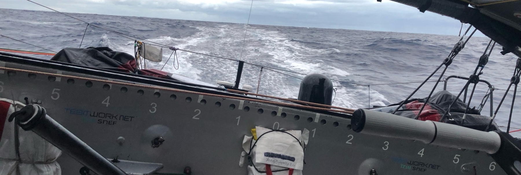 Arnaud Boissières et Benjamin Dutreux (4Cad – La Mie Câline, IMOCA) ont fait partie du contingent qui a réussi à éviter la dépression. Skippers d’expérience, ils témoignent de la difficulté à survivre dans ces conditions : « l’ambiance est sombre, un peu flippante, tu sens que tu n’es pas le boss » confie Benjamin. « Quand tu te fais un café, tu as 50% qui tombe à terre, 20% sur ton ciré et que 30% dans ton gosier », sourit Arnaud Boissières. « Le plus difficile, c’est de veiller à l’intensité, à ne pas être trop dans la performance et à limiter le nombre de manœuvres », poursuit Elodie Bonafous (Association Petits Princes – Queguiner). Il faut réussir à anticiper au maximum, veiller à ne pas réduire la voilure trop tard pour ne pas déchirer ses voiles ».