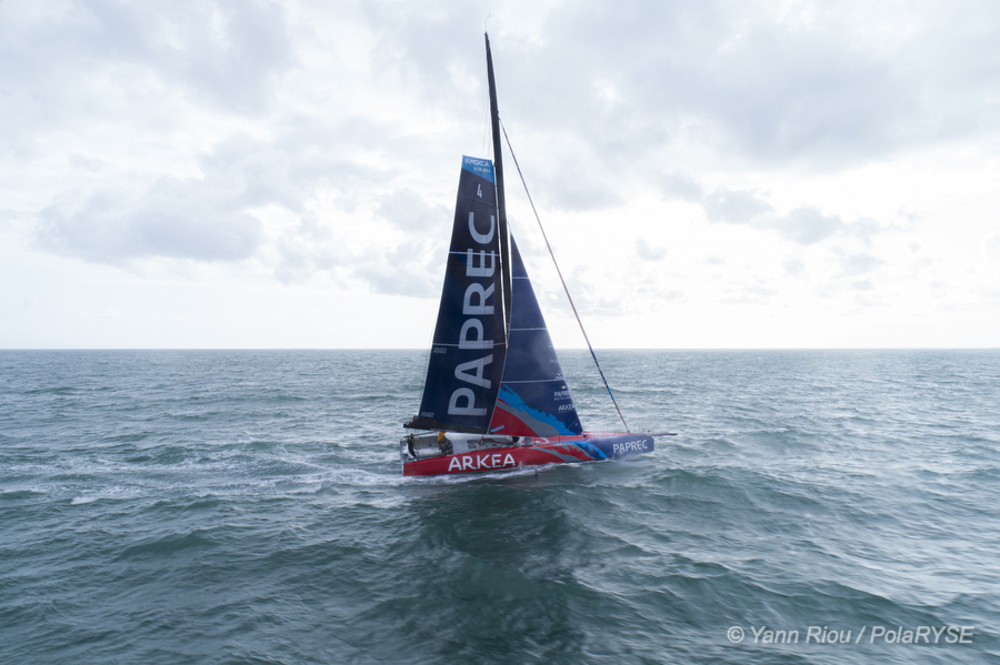 Sébastien Simon et Vincent Riou naviguent depuis vendredi sans foil sur leur nouvel imoca ARkea-Paprec. C’est vendredi à 11h qu’il ont prévenu leur équipe à terre que le second foil le tribord, venait de casser. Le bateau volait de façon stable dans l’alizé et sur une mer plate. L’avarie est survenue alors que le monocoque naviguait à 28 nœuds.