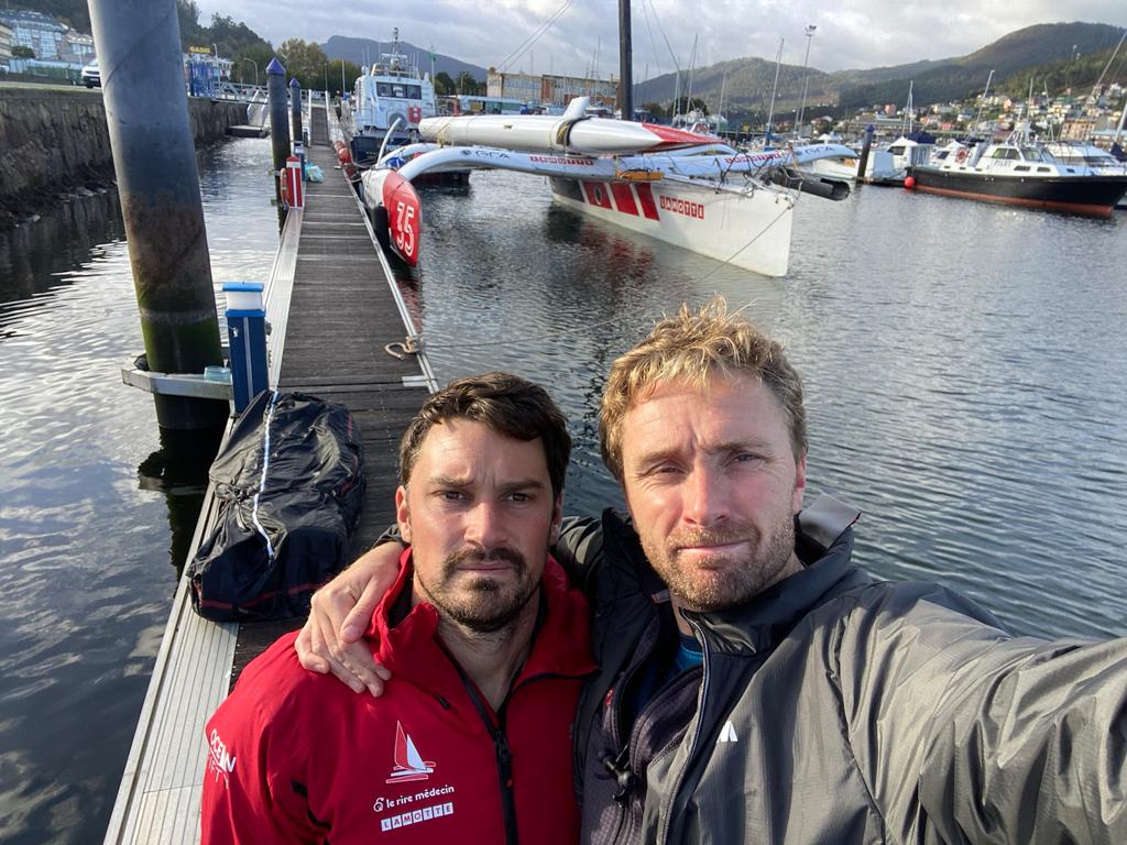 Le 7 novembre à 4h30, le bras avant bâbord a cassé de l’Ocean Fifty skippé par Luke Berry et Antoine Joubert entraînant le décrochage du flotteur et le démâtage. Adrien Hardy et son équipe sont arrivés très vite sur zone pour les aider à récupérer le plus d’éléments. Après 5 heures de travail sur l’eau, ils ont réussi à tout récupérer. S’en est suivi le convoyage tracté par le Merida pour rejoindre un port en Espagne et mettre le bateau en sécurité. Le lendemain, le flotteur a été chargé sur le bateau à l’aide d’une grue et un gréement de fortune a été mise en place. C’est seulement ce 16 novembre qu’une fenêtre météo s’est ouverte pour rejoindre St-Malo, port d’attache du bateau. Luke, Grégoire et Éric sont partis hier matin de Viveiro à bord de l’océan Fifty Le Rire Médecin – Lamotte pour rejoindre Saint-Malo avec un gréement de fortune (ils ont installé une partie du mât) et le flotteur bâbord bien arrimé sur le bateau. L’équipage remonte vers la Bretagne à 5,3 nœuds de moyenne. Ils vont mettre environ 3 jours et demi pour rejoindre Saint-Malo.