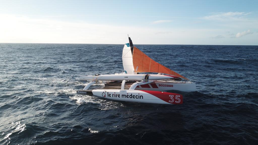 Alors que les 3 Ocean Fifty sont arrivés à bon port en Martinique, l’Ocean Fifty Le Rire Médecin – Lamotte tente de rentrer sous gréement de fortune et au moteur de la Corogne à St Malo après son abandon suite à la casse de son bras avant et un démâtage.