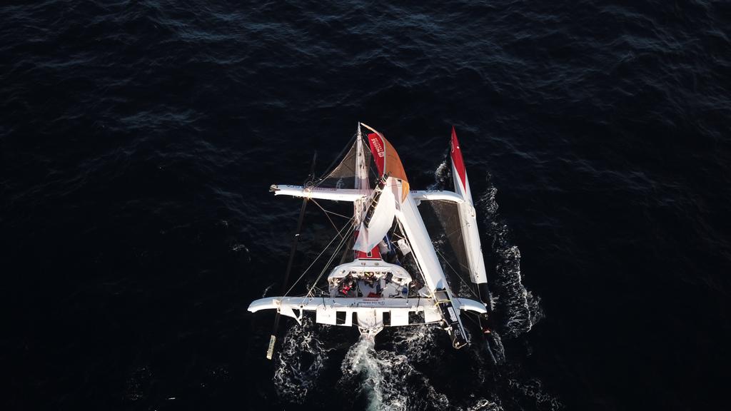 « Nous venions de passer un front. Les conditions étaient rudes mais maniables avec 25-30 nœuds de vent et environ 5 mètres de houle. Nous naviguions avec la toile adaptée, avec deux ris dans la grand-voile et le J3 à l’avant, raconte Luke. Dans un saut de vague, le bateau a accéléré et nous avons entendu un grand “crac”… nous avons vu le bras bâbord avant se casser, puis le flotteur se désolidariser de la coque centrale. Juste après, le mât est tombé. »