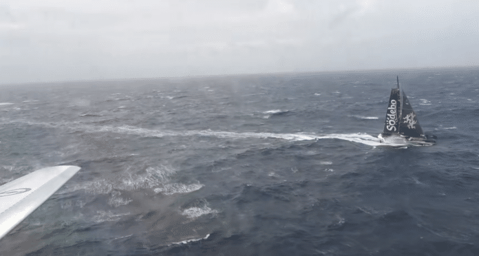 De retour d’une mission de surveillance, la Marine nationale a survolé Sodebo Ultim 3 dans le golfe de Gascogne et a échangé par VHF avec Frédéric Denis la veille de l’arrivée, permettant d’apprécier les conditions météorologiques.
