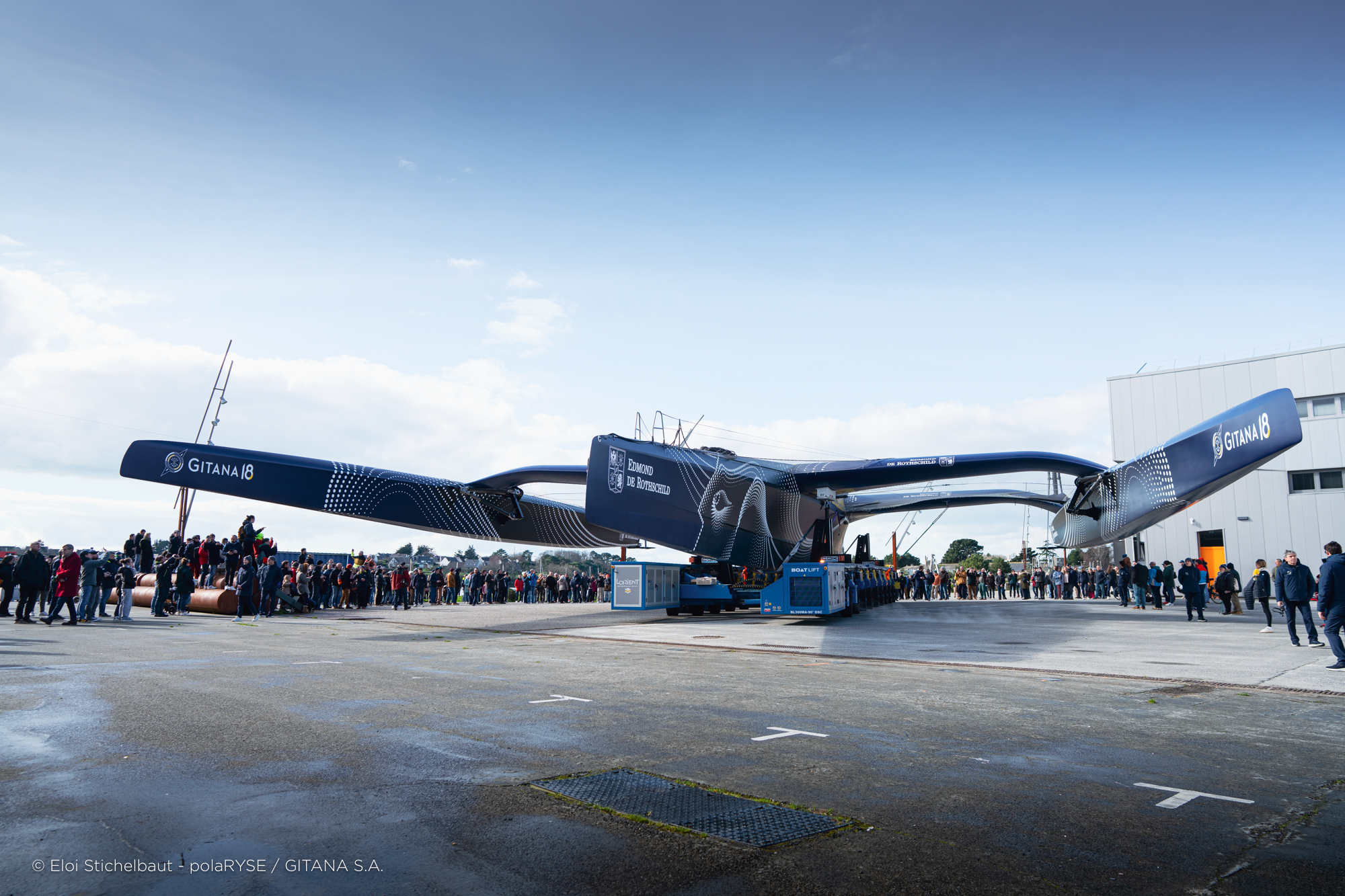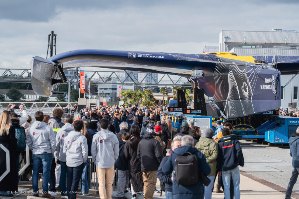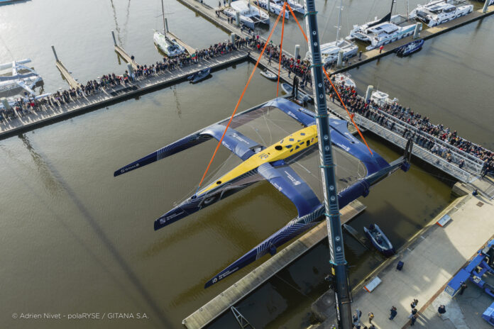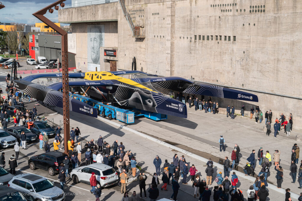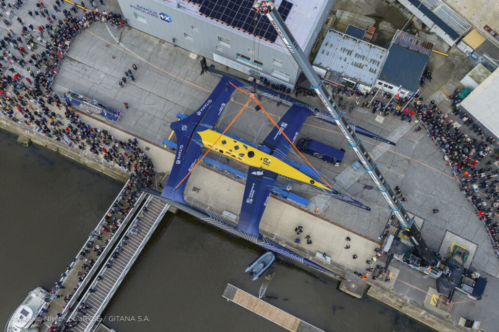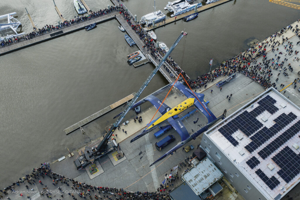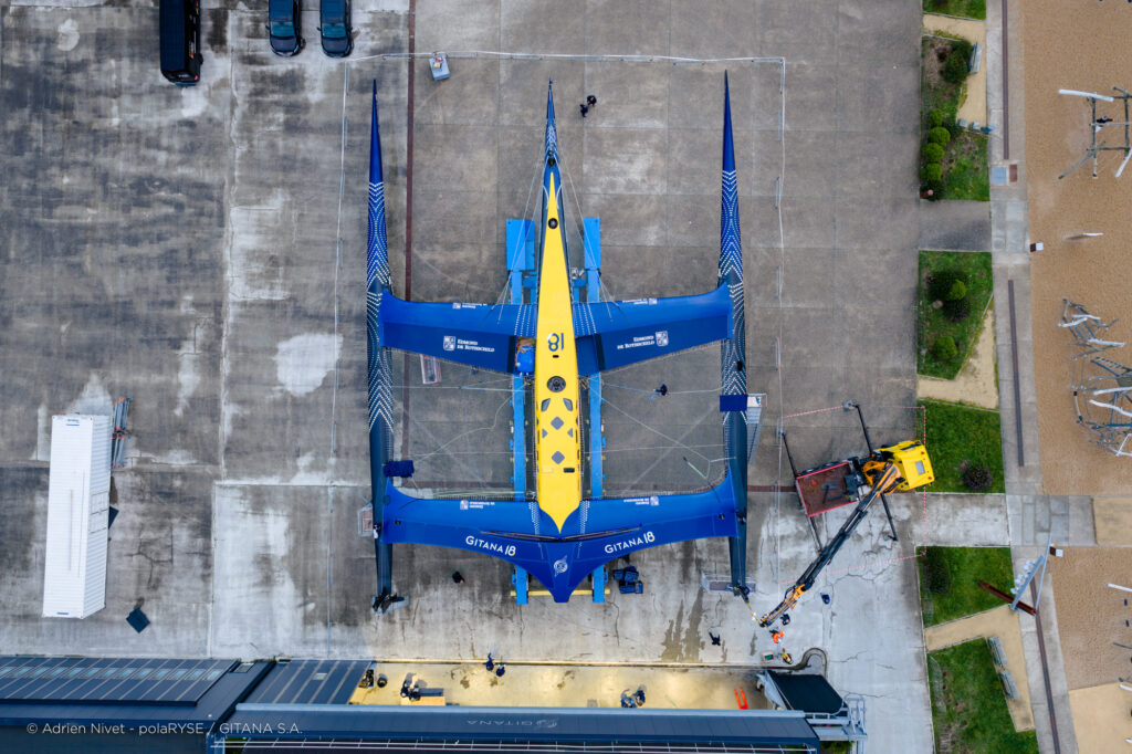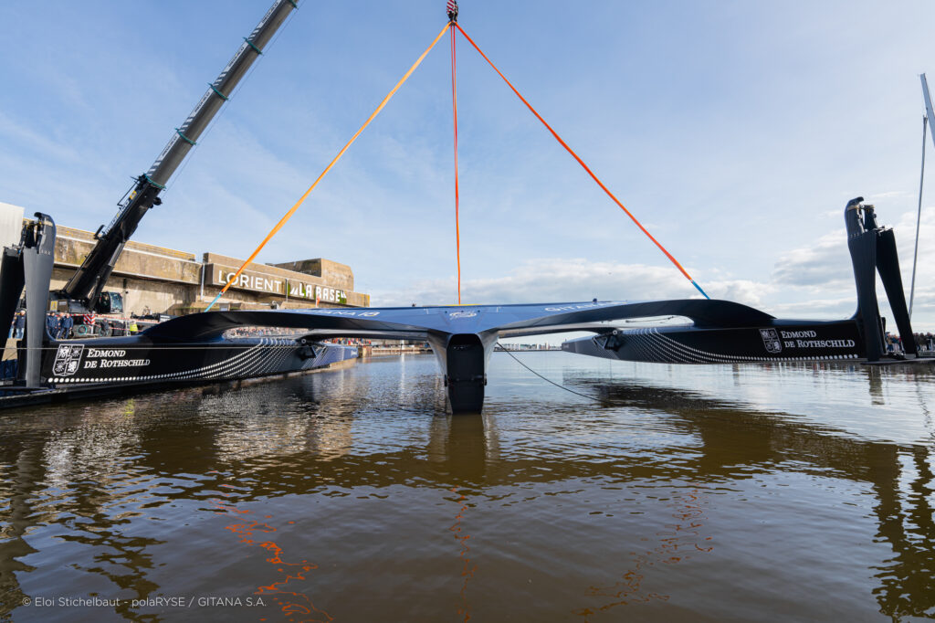 Entre deux tempêtes, Gitana 18 a été mis à l’eau ce 14 février à Lorient. Désormais amarré au ponton de son port d’attache, il faudra encore patienter quelques jours avant de voir le Maxi Edmond de Rothschild larguer les amarres et tirer ses premiers bords au large de Lorient et attendre encore un peu avant de le voir avec ses foils qui devraient être installés fin février.