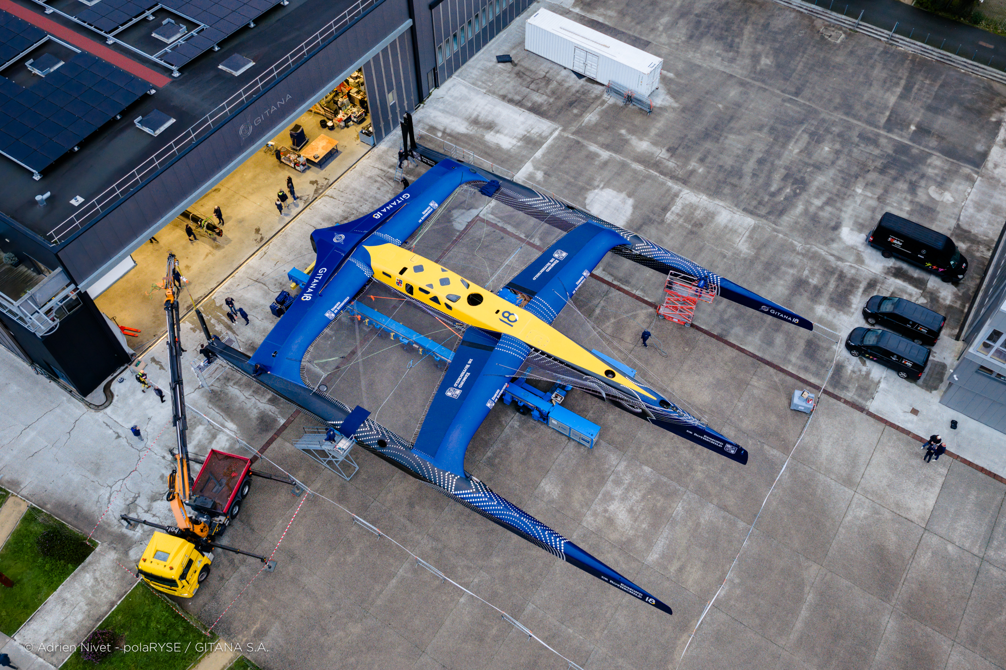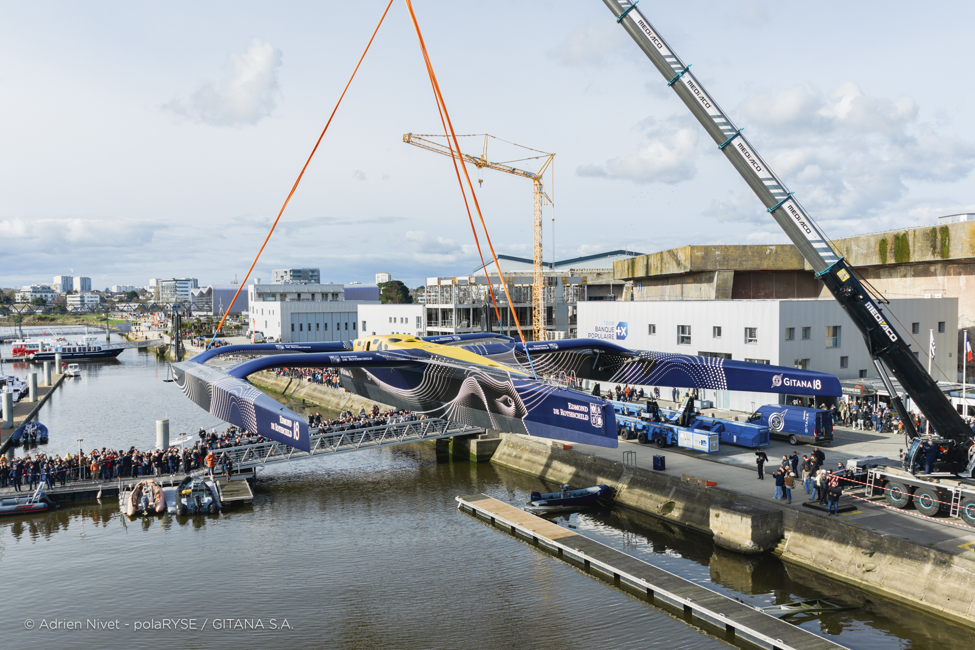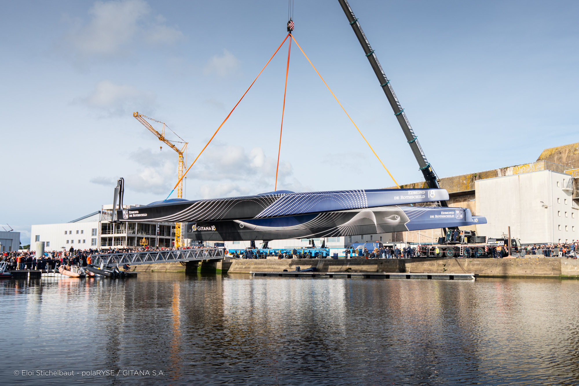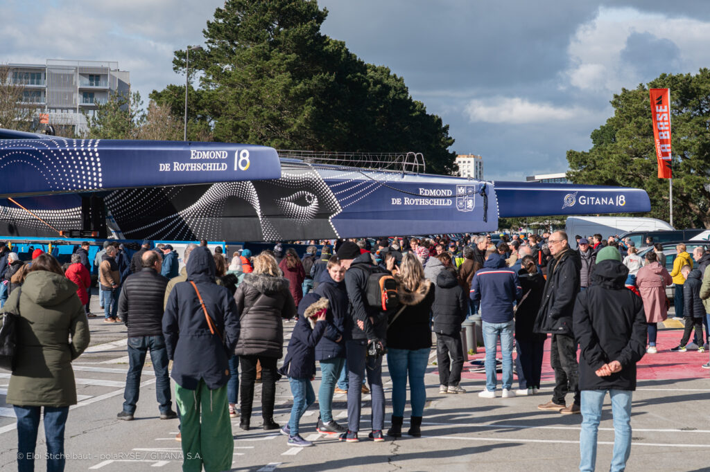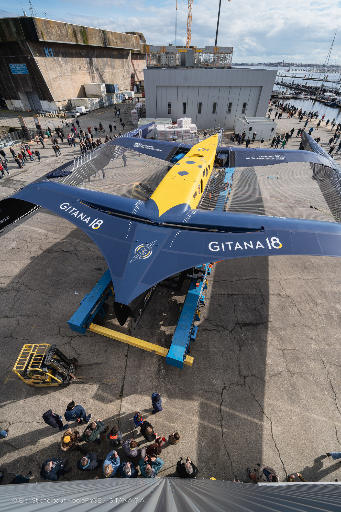 Entre deux tempêtes, Gitana 18 a été mis à l’eau ce 14 février à Lorient. Désormais amarré au ponton de son port d’attache, il faudra encore patienter quelques jours avant de voir le Maxi Edmond de Rothschild larguer les amarres et tirer ses premiers bords au large de Lorient et attendre encore un peu avant de le voir avec ses foils qui devraient être installés fin février.