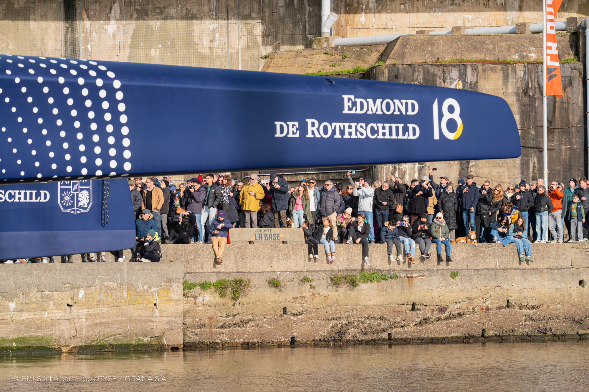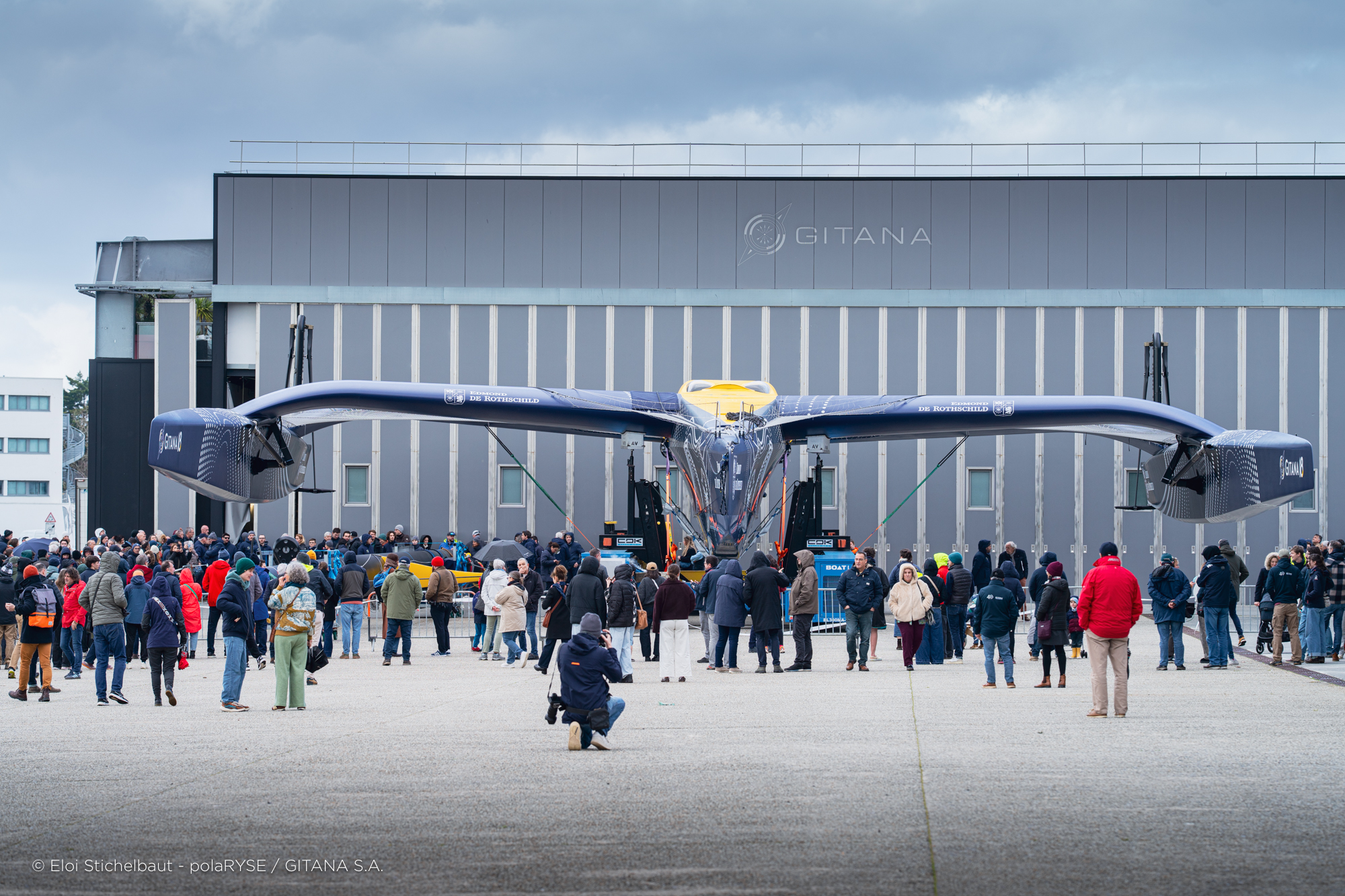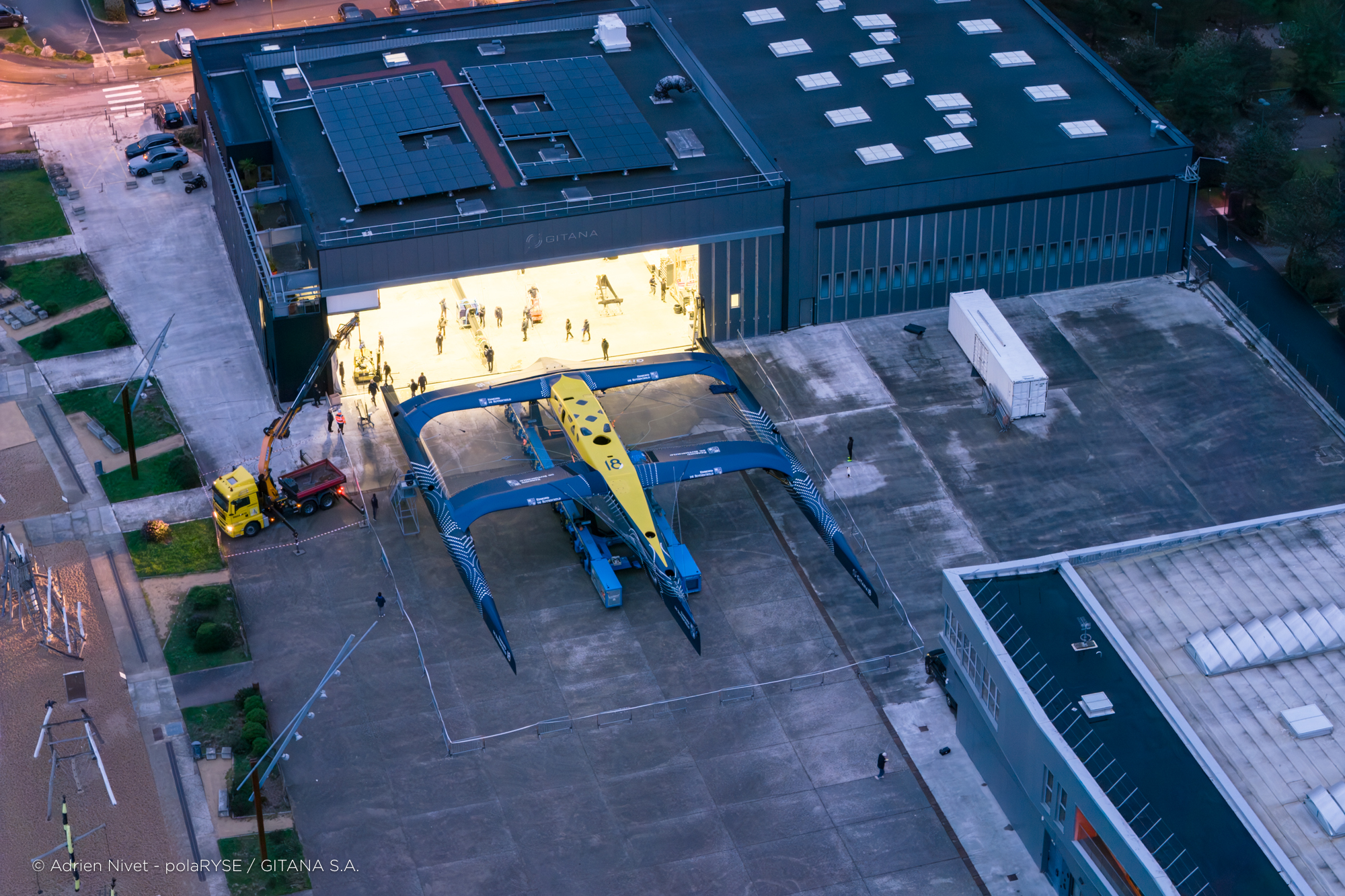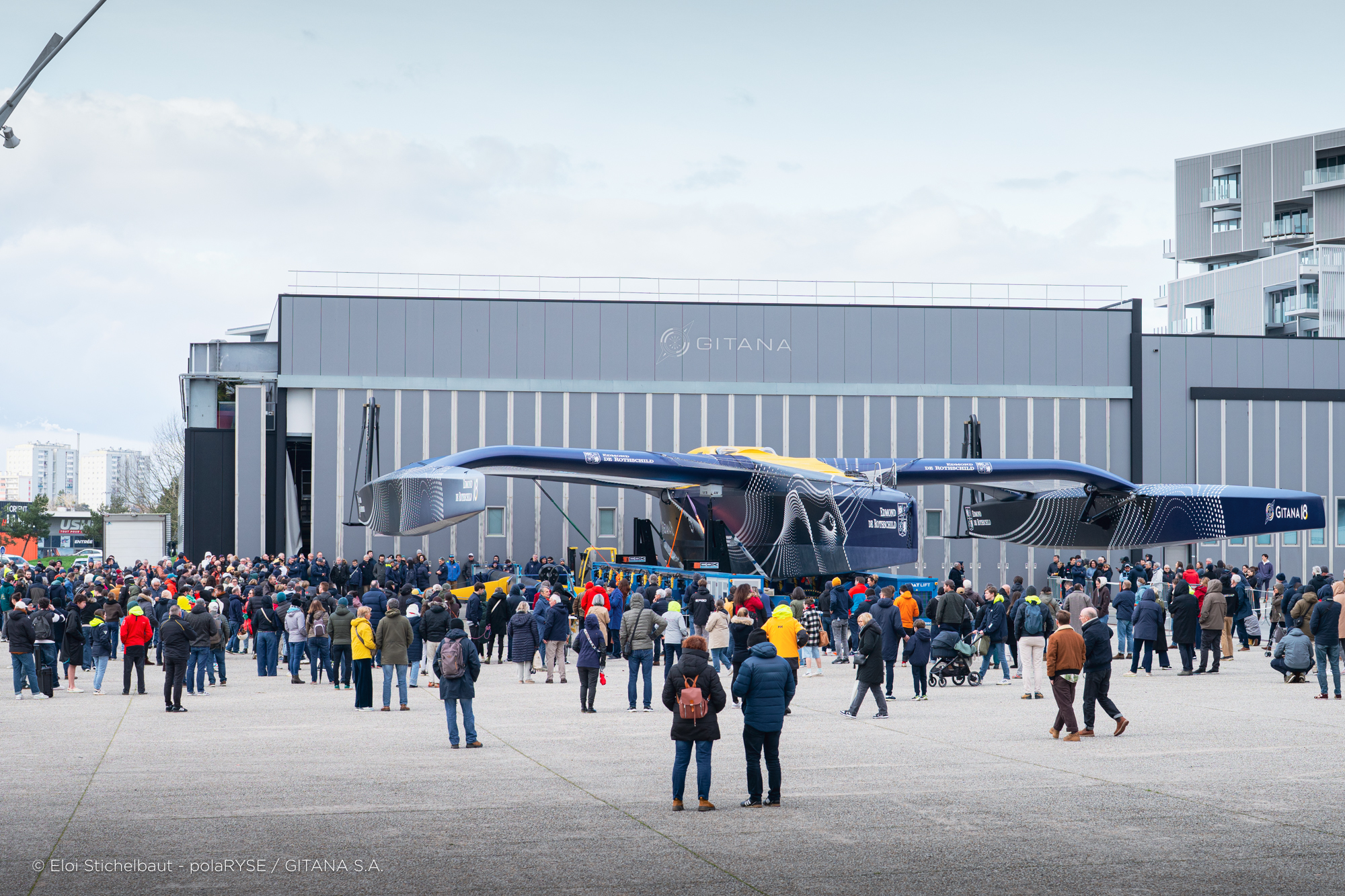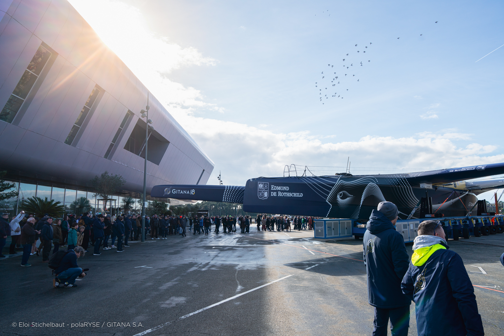 Entre deux tempêtes, Gitana 18 a été mis à l’eau ce 14 février à Lorient. Désormais amarré au ponton de son port d’attache, il faudra encore patienter quelques jours avant de voir le Maxi Edmond de Rothschild larguer les amarres et tirer ses premiers bords au large de Lorient et attendre encore un peu avant de le voir avec ses foils qui devraient être installés fin février.
