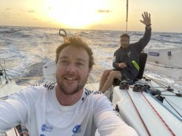 Jean Le Cam, Interface Concept : « Ça glisse bien, c’est super. Nous avons une nuit parfaite ! Le bateau va bien, il file… C’est la première fois depuis 10 jours qu’il file comme ça ! Nous avons prévu d’arriver rapidos à St Barth. Et notre ETA est mardi à 22h45 TU. »