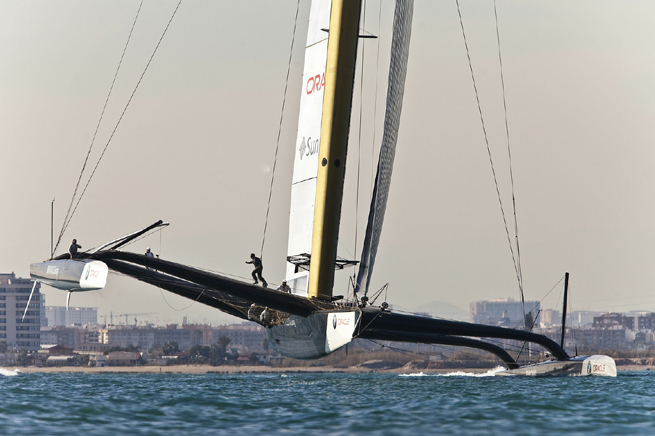 L’effervescence est la même dans le camp américain. Le trimaran de Larry Ellison n’est pas en face de sa base dans la Darsena mais dans le port de commerce de Valence, sur une zone plus adaptée à la manipulation de son aile rigide. Mis à l’eau et « ailé » dans la foulée ce matin, USA devrait rejoindre également le plan d’eau. A Valence, la mer est plate avec une faible brise de 5 à 6 nœuds d’ouest-nord-ouest.