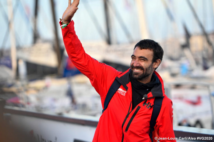 Le jeune Suisse de 27 ans Alan Roura, skipper de La Fabrique, s’est de nouveau laissé gagner par l’émotion ce dimanche matin, en quittant sa fille de tout juste 4 mois, d’abord, en partant de son appartement sablais. En saluant ensuite les médias, partenaires et officiels au cours de sa descente sur les pontons. Puis en larguant les amarres, laissant une partie de son équipe ainsi que son épouse sur les semi-rigides escortant son navire, limitation du nombre de personnes autorisées à bord de l’IMOCA oblige. Et enfin, en traversant un chenal désert, hanté par quelques âmes chanceuses d’habiter alentours. « C’est bizarre… confiait Alan une fois sur le plan d’eau. Mais ça a le mérite de nous habituer dès maintenant aux trois mois de solitude qui nous attendent ! » Entre larmes et grands sourires qui lui sont si caractéristiques, le Genevois a finalement tenu à saluer la foule restreinte d’un chaleureux clin d’oeil. Lui qui déclarait récemment ne pas avoir prévu de « tenue » particulière a malgré tout sortie une casquette de marin, similaire à celle de 2016, vissée sur la tête pour les derniers mètres du chenal. Son costume de skipper désormais enfilé, place à la course et direction la ligne de départ…