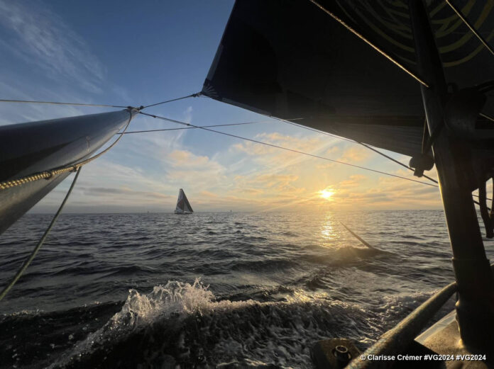 Après un départ plutôt calme, les skippers ont pu accélérer pendant la nuit. Les foilers, contraints d’allonger leur trajectoire, ont dû composer avec leur vitesse, tandis que les bateaux à dérive ont pu emprunter une route plus directe. En tête de la course, Charlie Dalin avance à une moyenne de 23 nœuds, suivi de près par Sébastien Simon (Groupe Dubreuil). Jean Le Cam, sur Tout Commence en Finistère – Armor Lux, est le premier représentant des bateaux à dérive, juste devant Louis Duc Fives Group Lantana.