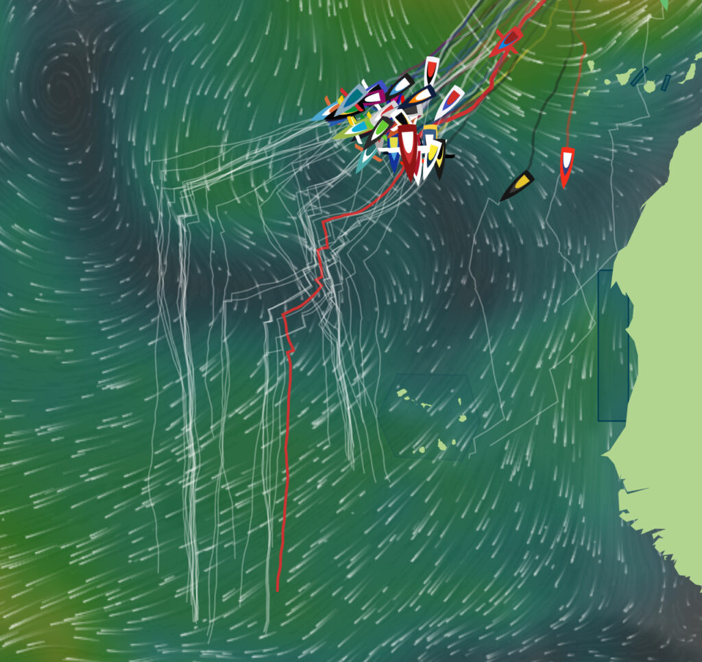 Éparpillée et alignée sur plus de 100 milles nautiques, la flotte s’est presque entièrement regroupée après avoir buté contre une pseudo-dorsale anticyclonique, formée sous la pression d’une dépression située au nord. Cette situation évolue sans cesse, et les fichiers météo peinent à la modéliser correctement, rendant le choix du bon passage particulièrement ardu. Après plusieurs heures passées dans la pétole, les skippers ont retrouvé du vent vers 4 heures du matin, ce qui leur a permis de repartir. À l’ouest, les marins bénéficient d’une meilleure pression et naviguent à 10-12 nœuds, tandis qu’au sud, les vitesses restent plus modestes. Le pari de Jean Le Cam, positionné à l’est, paraît incertain pour les heures à venir, mais rien ne dit que cela ne finira pas par payer.