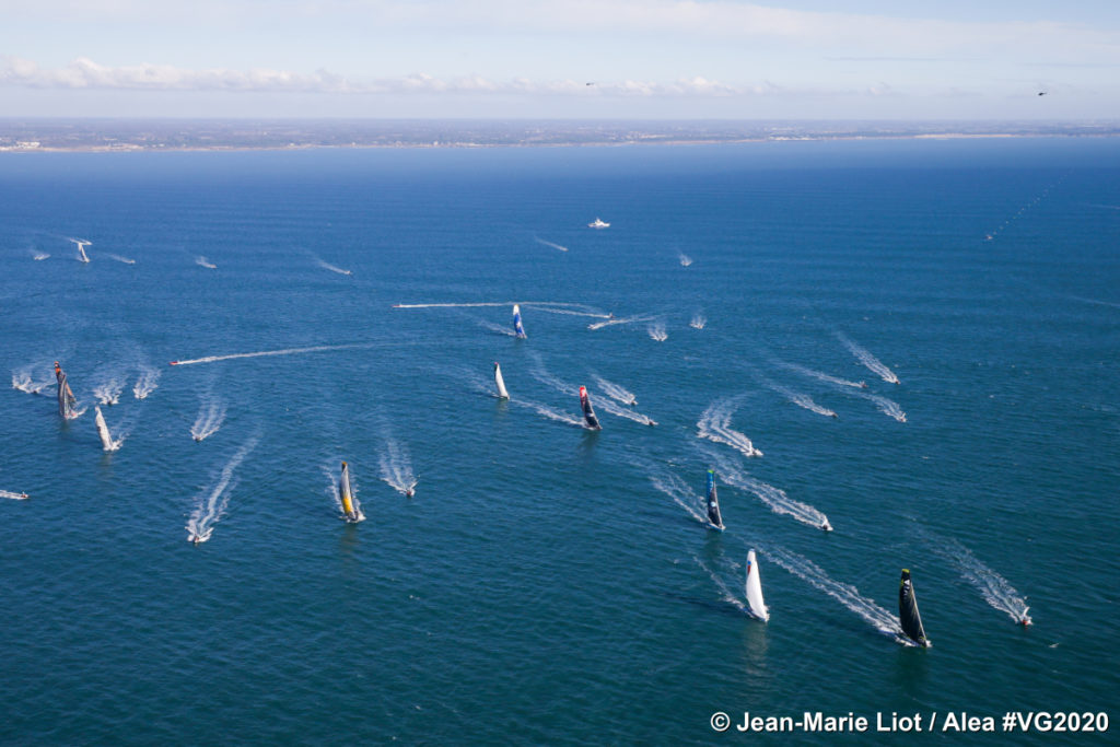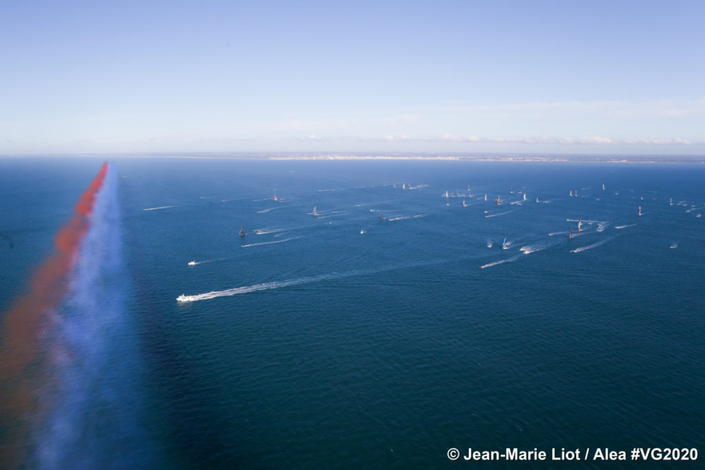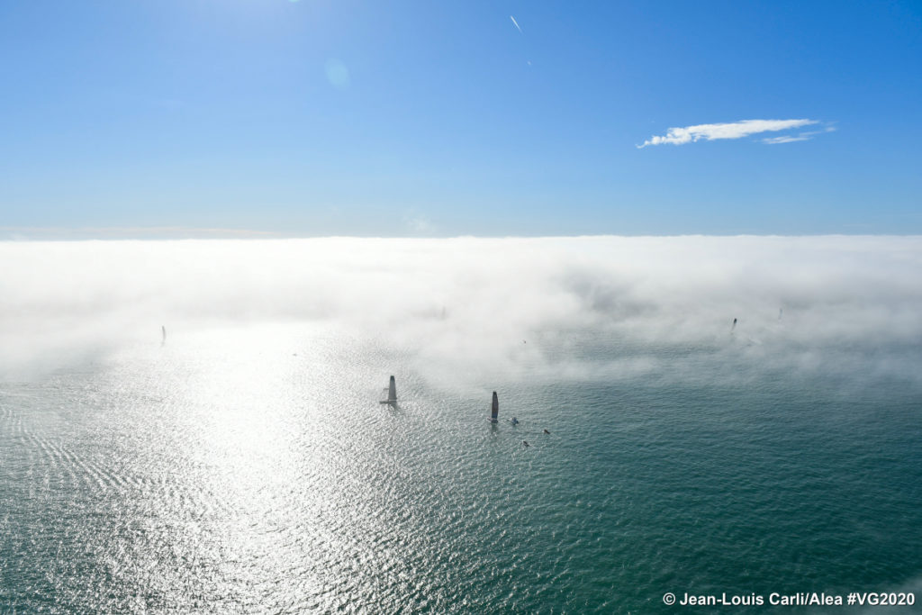 Prévu traditionnellement à 13h02 – pour que les JT puisse le passer en direct – le départ du Vendée Globe a du être décalé à 14h20 à cause d’un léger brouillard. Cela a donné quelques photos assez originales qui marqueront cette édition qui décidément ne ressemble à aucune autre.