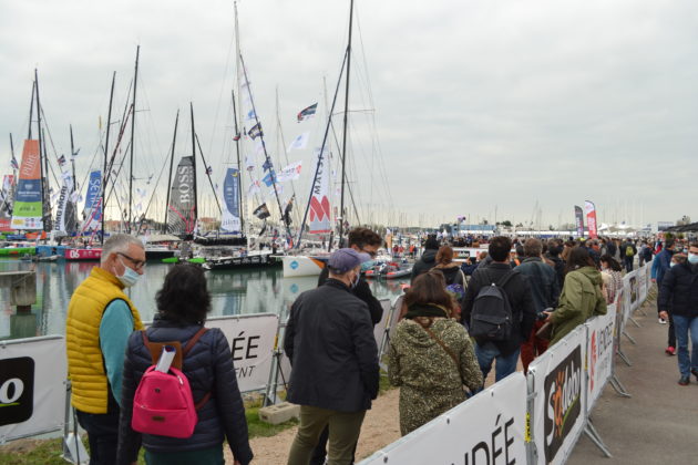 La jauge de 5000 personnes sur le village est strictement contrôlée par un contrôle d’accès en entrée et en sortie. Avant d’arriver au plus près des bateaux- 600 personnes sont autorisées en simultané – le visiteur pourra notamment évoluer dans un espace immersif présentant la vie à bord d’un IMOCA. En dépit de toutes ces contraintes et un début poussif de fréquentation en matinée pour ce premier week-end, le grand public se pressait avec le sourire comme à l’habitude aux abords des pontons pour admirer les bateaux sous une météo clémente.